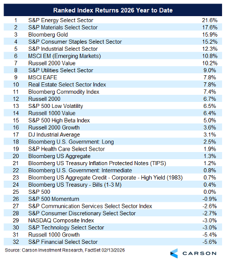Here we are on February 17 and the S&P 500 is almost exactly flat for the year (as of Friday) after falling a little over 1% last week. This doesn’t worry us. We’ve noted that February has a history of being a banana peel month and many other areas of the market have held up better, providing some added resilience for many diversified investors. We still believe the S&P 500 can very reasonably return 12% to 15% this year, a view we presented in our 2026 Outlook. There’s nothing we’ve seen so far that would change that view. If anything, recent earnings and labor market data have come in better than expected. In the meantime, we’re glad to see some changes in market leadership and a broadening market, another theme we discussed in our Outlook, as leadership rotation is often a sign of a healthy bull market.